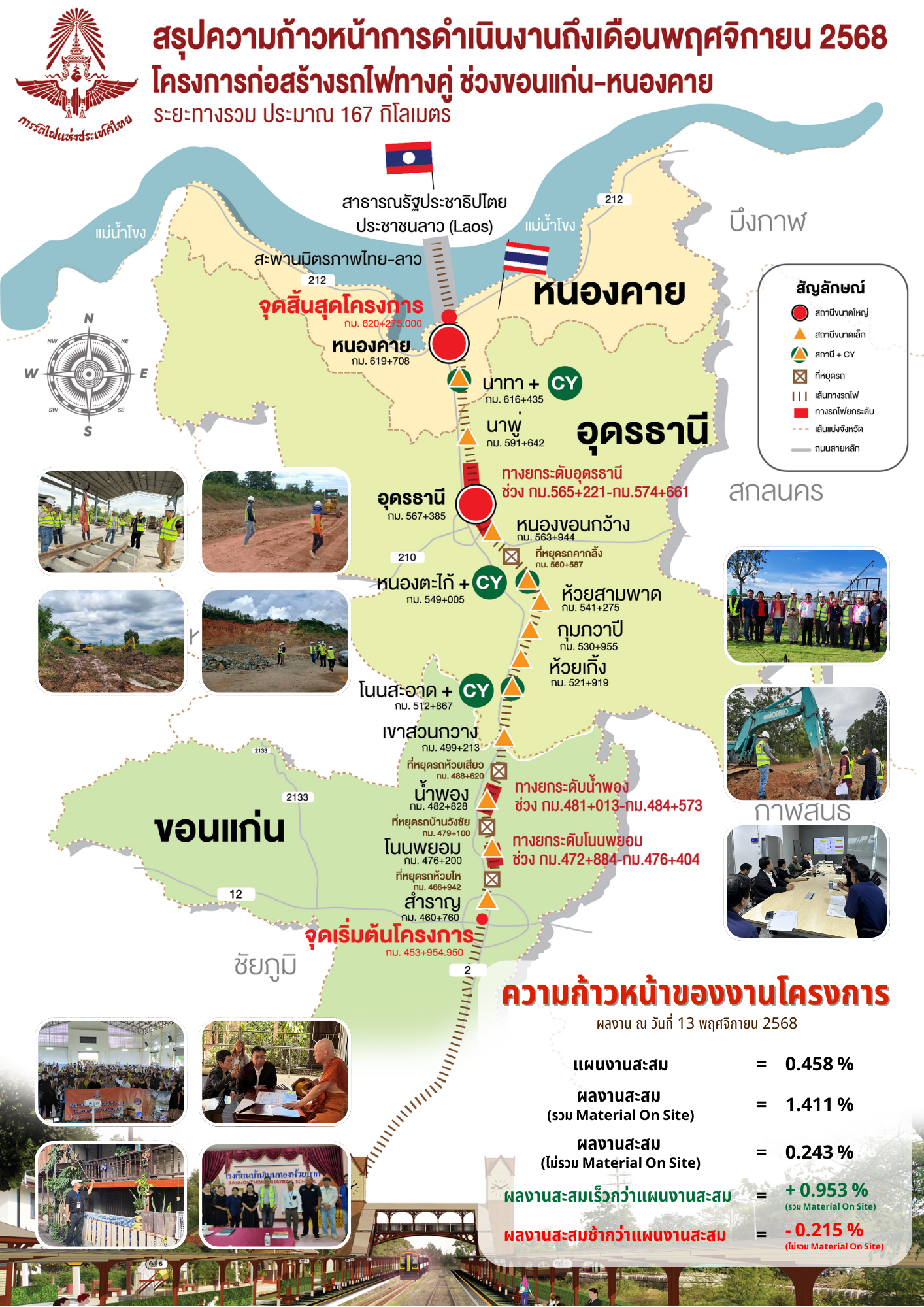 โดยโครงการก่อสร้างรถไฟทางคู่ ช่วงขอนแก่น–หนองคาย รายงานข้อมูลแผนงานสะสมอยู่ที่ร้อยละ 0.458 และผลงานสะสมอยู่ที่ร้อยละ 1.411 ซึ่งผลงานสะสมเร็วกว่าผลงานสะสม ร้อยละ 0.953 และโครงการฯ ยังคงมุ่งมั่นดำเนินงานให้เป็นไปตามแผนที่กำหนด เพื่อยกระดับระบบรางของประเทศและเพิ่มศักยภาพการขนส่งให้มีความสะดวก ปลอดภัย และมีประสิทธิภาพยิ่งขึ้น